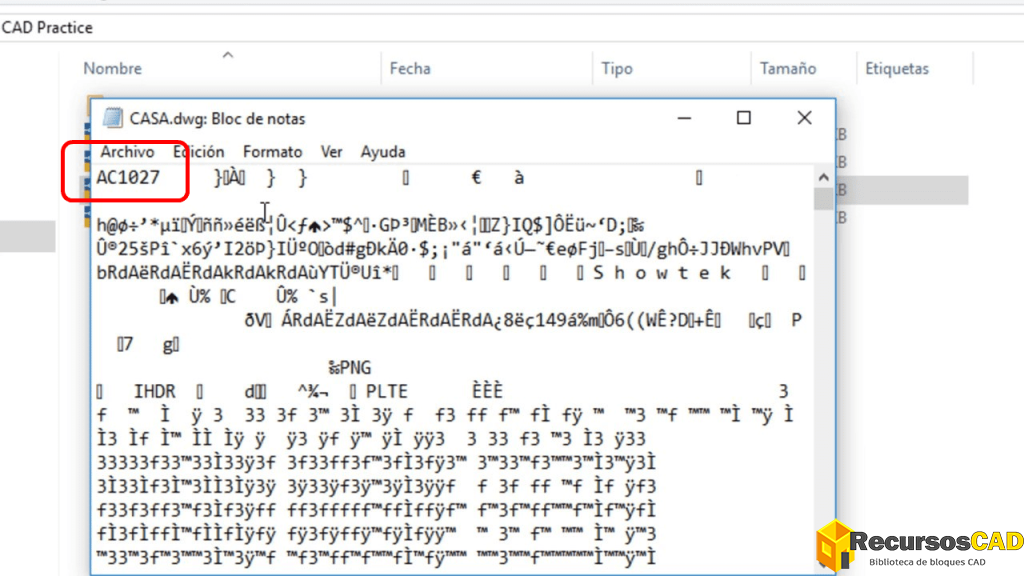 - Abrir el archivo DWG en un Bloc de notas de Windows: También puedes abrir el archivo DWG en el Bloc de notas. Los seis primeros carácteres te mostrarán el código de la versión del archivo DWG.