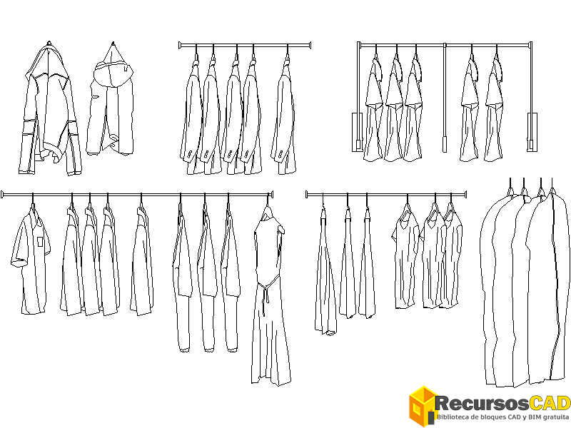 - Descripción: Prendas de vestir ropa para colgar en armario Pantalones, chaquetas, trajes, camisetas, camisas, perchas., dibujo AutoCAD con extensión .dwg